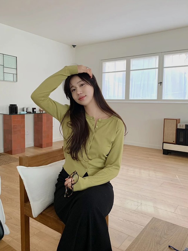 Để tăng thêm sự tươi mới cho style mùa đông, các nàng hãy chọn áo cardigan mỏng mang tông màu xanh nhạt. Vốn dĩ, mẫu áo này đã nổi bật nên chị em chỉ cần kết hợp với quần ống suông màu đen, vậy là có được vẻ ngoài ấn tượng mà chẳng kém phần hài hòa, tinh tế.