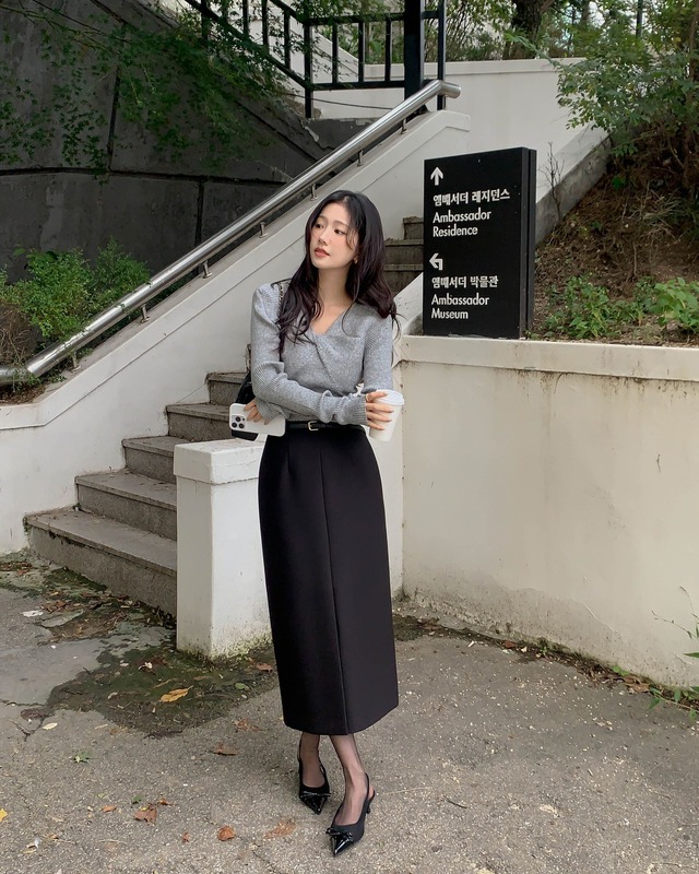 Công thức trên hoàn hảo để dành cho môi trường công sở. Sự kết hợp giữa áo len màu xám và chân váy suông màu đen toát lên nét trang nhã, sang trọng. Để vẻ ngoài chuẩn thanh lịch và chuyên nghiệp, chị em hãy sơ vin, tô điểm thắt lưng da và đi giày slingback mũi nhọn.